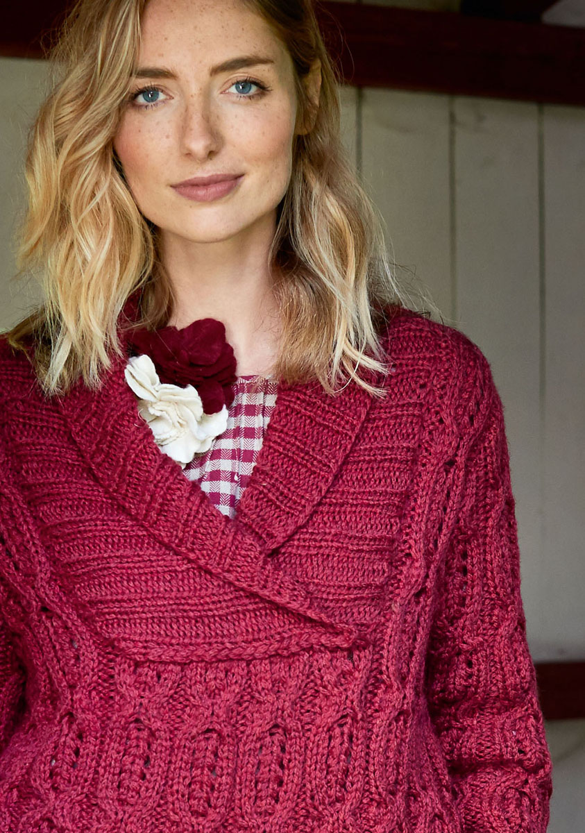 Lana Grossa Qualität „Landlust Merino 120“ (100 % Schurwolle (Merino superwash), LL = ca. 120 m/50 g): ca. 500 (550) g Dunkelrot (Fb. 111); Stricknadeln Nr. 7 und 8, 1 Rundstricknadel Nr. 7, 80 cm lang, 1 Zopfnadel.