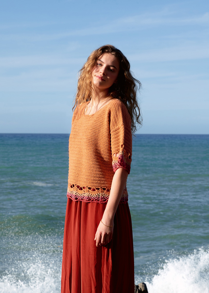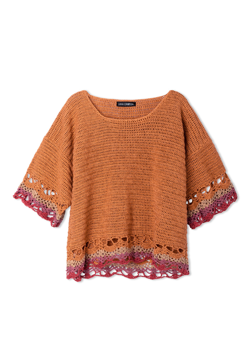 Lana Grossa-Qualität „Diversa” (74 % Baumwolle, 26 % Viskose, LL = ca. 210 m/50 g): ca. 350 (400) g Orange (Fb. 21) und je ca. 50 g Rostrot (Fb. 22), Topasorange (Fb. 31) und Erika (Fb. 32); 1 Wollhäkelnadel Nr. 3,5.
