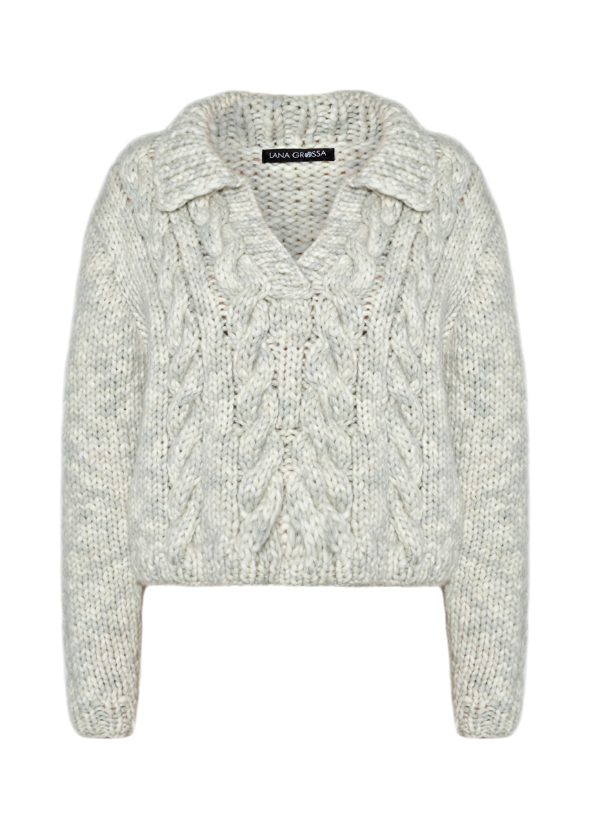Lana Grossa-Qualität „Inizio“ (54 % Schurwolle (Merino), 18 % Modal, 16 % Polyamid, 12 % Baumwolle, Lauflänge 60 m/50 g): ca. 600 (650) g Rohweiß/Silbergrau (Fb. 102) und Lana Grossa-Qualität „Silkhair“ (70 % Mohair (Superkid), 30 % Seide, Lauflänge 210 m/25 g): ca. 75 (100) g Silbergrau (Fb. 41); Stricknadeln Nr. 9 und 10, 1 Rundstricknadel Nr. 9, 60 cm lang, 1 Zopfnadel [= Hilfsnadel].