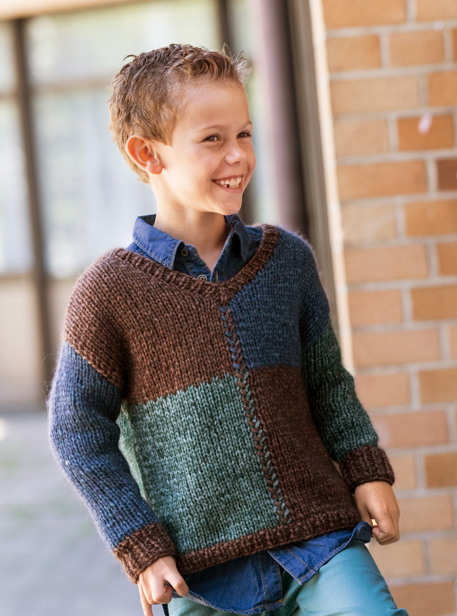Lana Grossa Insieme (50% Schurwolle Merino 19 micron, 20% Baby Alpaka, 20% Mohair Super Kid, 10% Polyamid, Lauflänge 75 m/50 g), 150 (200) g Rot-/Dunkelbraun (Fb 10), 100 (150) g Mint/Petrol (Fb 4) und 100 (150) g Jeans/Dunkelblau (Fb 6); Stricknadeln Nr. 7 und 8, 1 Rundstricknadel Nr. 7, 40 cm lang
