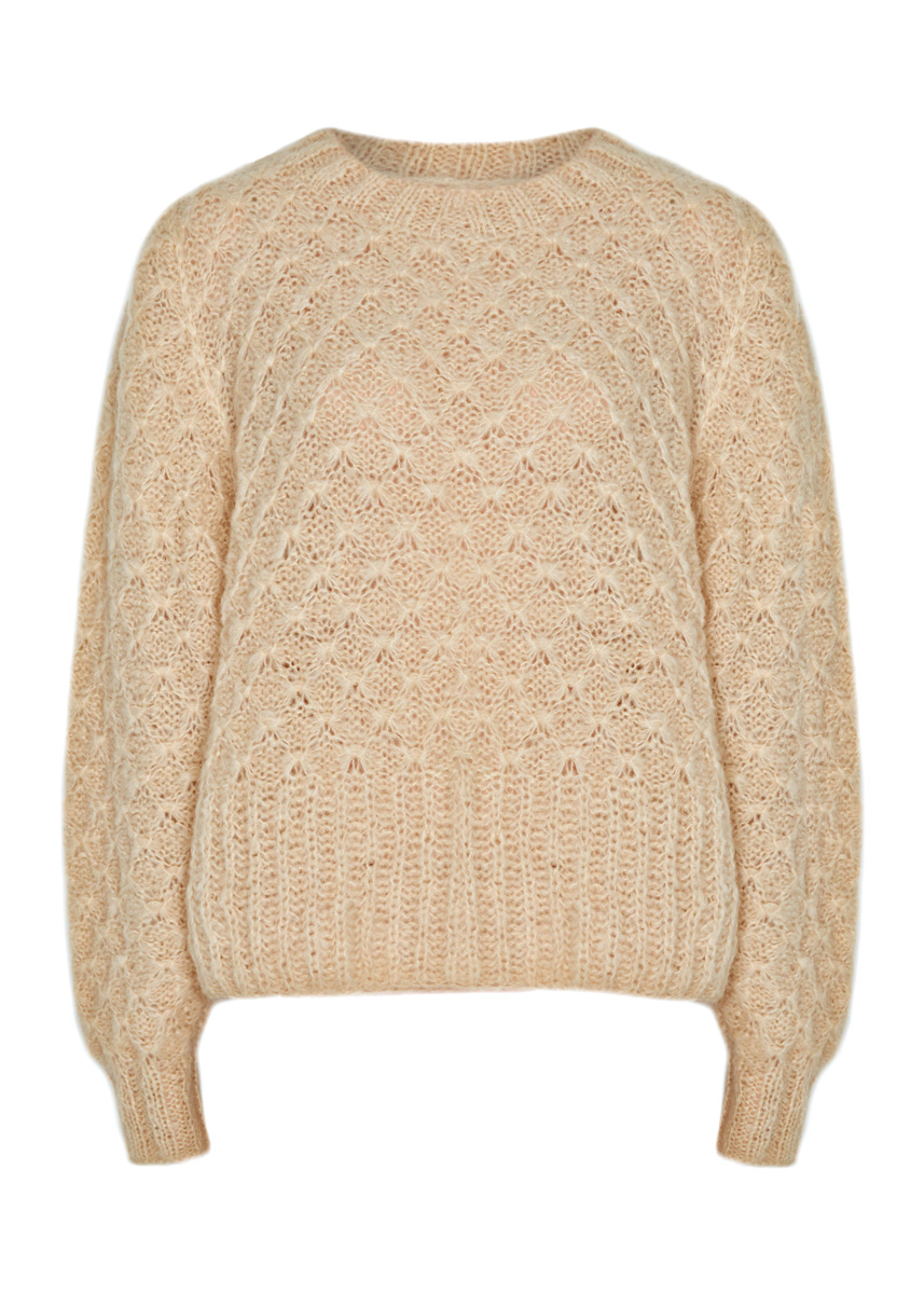 Lana Grossa-Qualität „Lala Berlin Brushy“ (42 % Mohair (Superkid), 38 % Schurwolle (Merino), 20 % Polyamid, Lauflänge 135 m/50 g): ca. 350 (400) g Beige (Fb. 7); Stricknadeln Nr. 5,5 und 6, 1 Rundstricknadel Nr. 5,5, 50 cm lang, 1 Wollhäkelnadel Nr. 5,5.