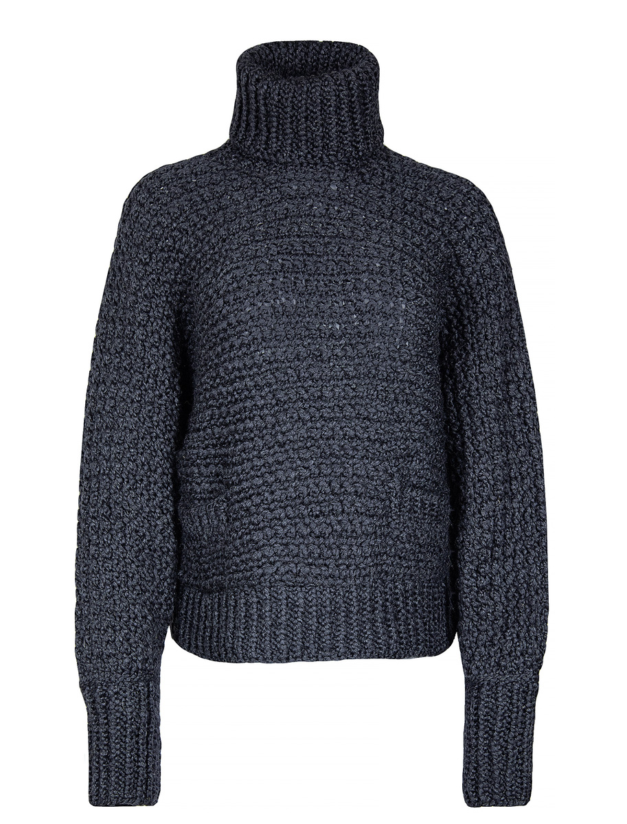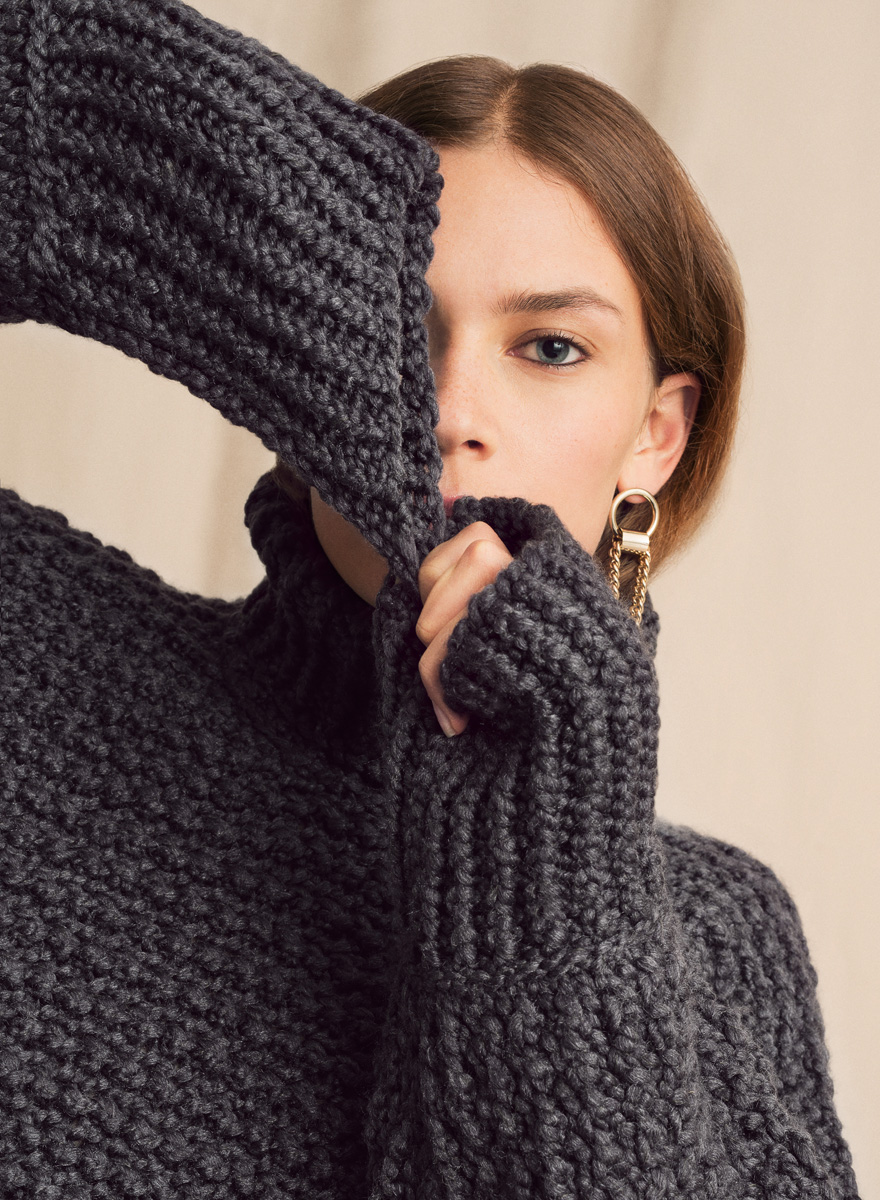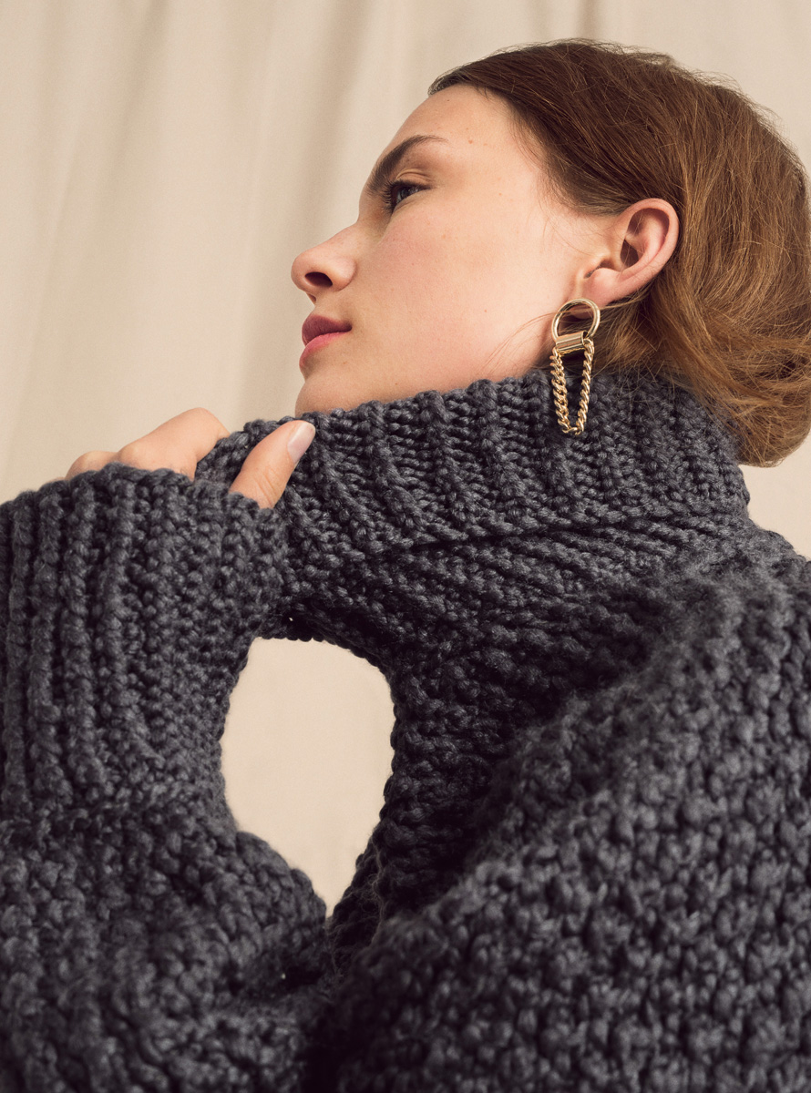 Lana Grossa-Qualität „Lala Berlin Chunky“ (80 % Schurwolle (Merino), 15 % Seide, 5 % Polyamid, Lauflänge 50 m/50 g): ca. 900 (950) g Anthrazit (Fb. 11); Stricknadeln Nr. 7 und 8, je 1 Rundstricknadel Nr. 7, 40 und 80 cm lang, 1 Rundstricknadel Nr. 8, 80 cm lang.