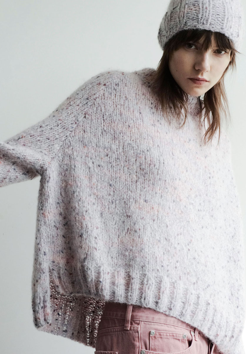 Lana Grossa Lala Berlin Fluffy (42 % Schurwolle, 21 % Polyamid,19 % Alpaka, 18 % Mohair, Lauflänge 130 m/50 g) 300 (350 – 400) g Rosa meliert (Fb 114); Stricknadeln Nr. 5, 6 und 6,5; eine 40 cm lange Rundstricknadel Nr. 6.