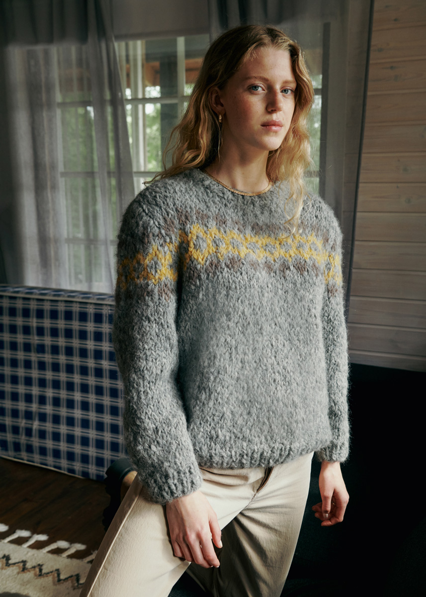 Lana Grossa-Qualität „Lala Berlin Furry“ (90 % (Baby) Alpaka, 10 % Polyamid, Lauflänge 75 m/50 g): ca. 400 (450) g Grau (Fb. 11) und je ca. 50 (100) g Taupe (Fb. 20) und Gelb (Fb. 3); Stricknadeln Nr. 8 und 9, 1 Rundstricknadel Nr. 8, 50 cm lang.
