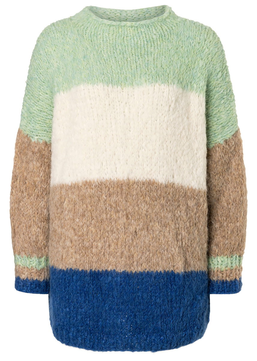 Der perfekte Sweater für Einsteiger und Ungeduldige ist simpel gestrickt und aus voluminösem Pelzeffektgarn. Spannend wird er durch den neuen Farb-Cocktail aus zarten Tönen und leuchtendem Blau.
