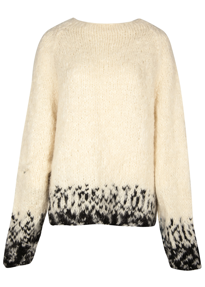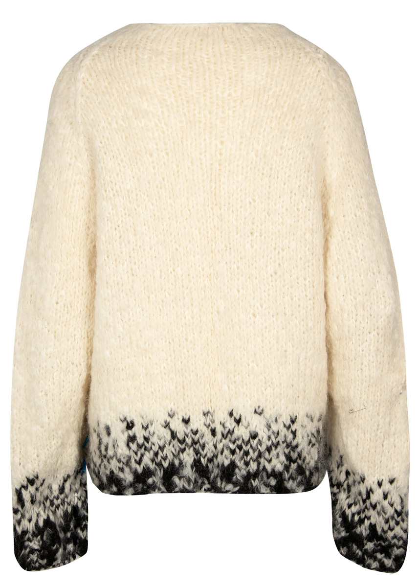 Lana Grossa „Lala Berlin Furry“ (90% Baby Alpaka, 10% Polyamid, Lauflänge 75 m/50 g), 400 (450) g Rohweiß (Fb 1) und Lana Grossa „Lala Berlin Furry Bicolor“ (90% Baby Alpaka, 10% Polyamid, Lauflänge 75 m/50 g), 100 g Schwarz/ Rohweiß (Fb 103); Stricknadeln Nr. 8 und 1 Rundstricknadel Nr. 8, 40 cm lang.