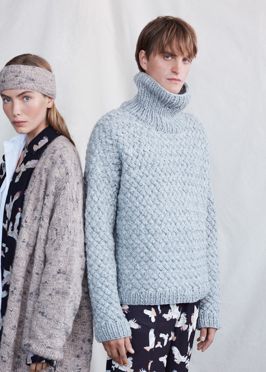Lana Grossa „Lala Berlin Lovely Cotton“ (75% Schurwolle Merino extrafein, 25% Baumwolle, Lauflänge 90 m/50 g), 800 (850 – 900) g Hellgrau (Fb 5); Stricknadeln Nr. 7 und 10, 1 Rundstricknadel Nr. 7, 40 cm lang, 1 Zopfnadel.