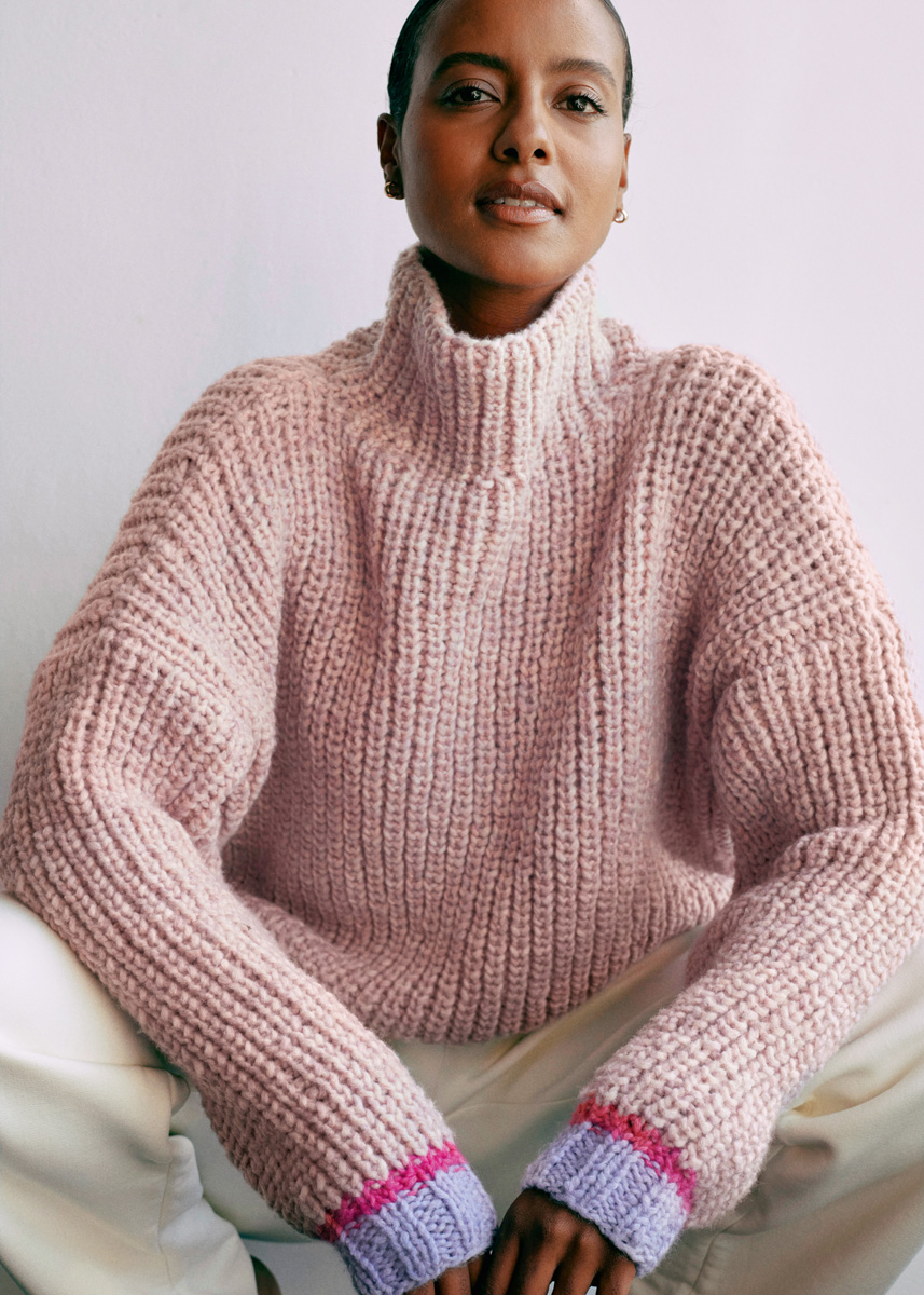Lana Grossa-Qualität „Lala Berlin Lovely Cotton“ (75 % Schurwolle (Merino superfein), 25 % Baumwolle, LL = ca 90 m/50 g): ca 650 (700 - 750 - 800) g Rosa (Fb 6), ca 50 (100 - 100 - 100) g Flieder (Fb 29) und ca 50 (50 - 50 - 50) g Pink (Fb 28); Stricknadeln Nr 6 und 6,5; 1 Rundstricknadel Nr 6.