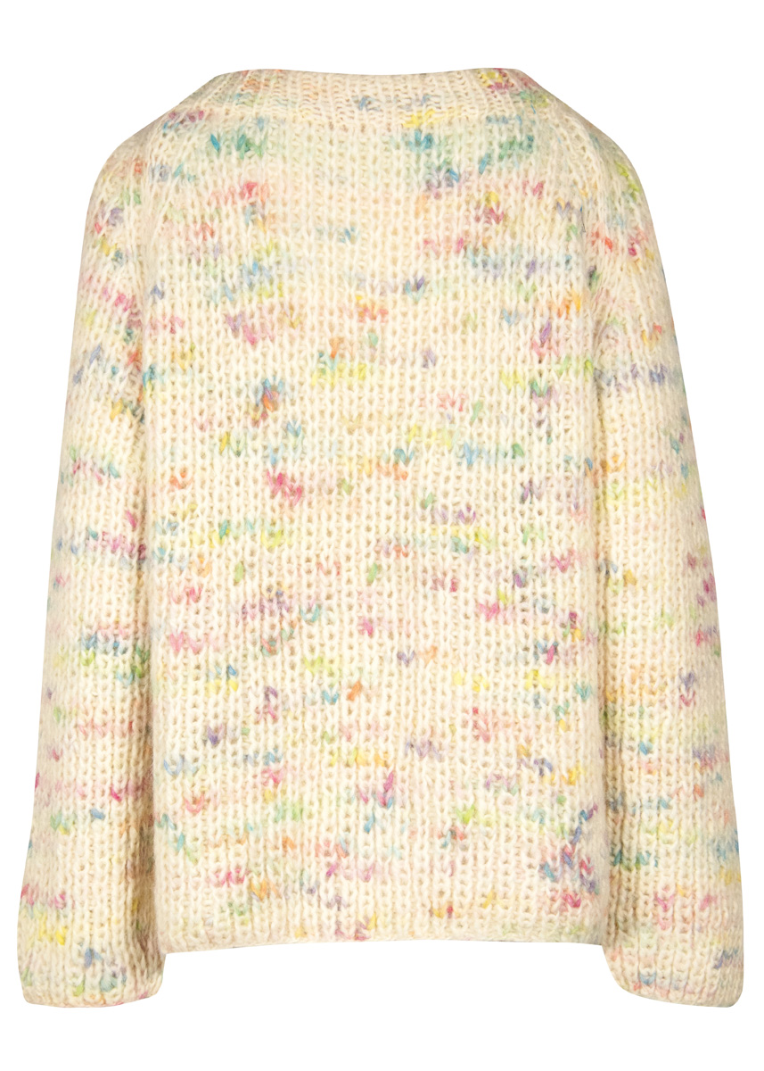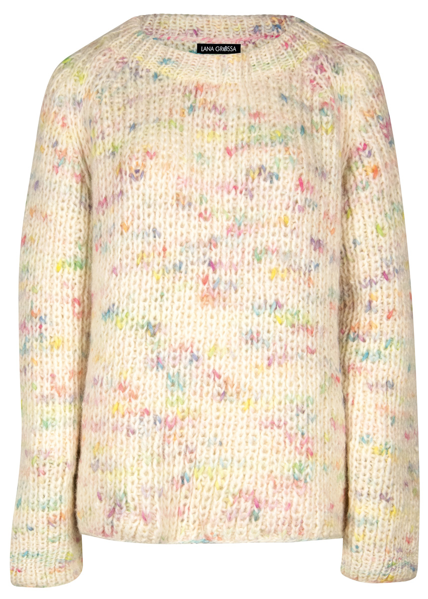 Lana Grossa „Lala Berlin Lovely Cotton Inserto“ (50% Baby Alpaka, 35% Baumwolle, 15% Schurwolle, Lauflänge 110 m/50 g), 550 (600 – 650) g Rohweiß/Pink/Türkis (Fb 106); Stricknadeln Nr. 8 und 1 Rundstricknadel Nr. 7, 40 cm lang.