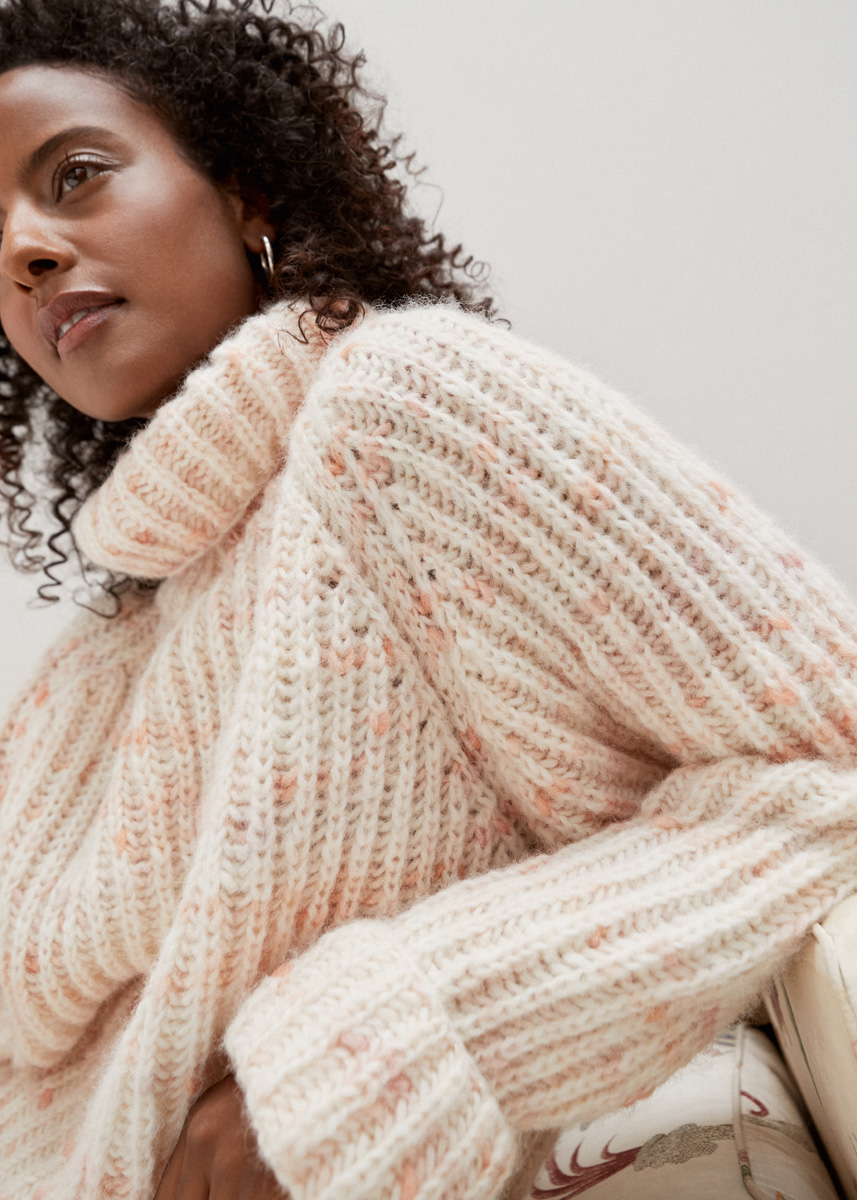 Lana Grossa-Qualität „Lala Berlin Lovely Cotton Inserto“ (50 % (Baby) Alpaka, 35 % Baumwolle, 15 % Schurwolle, Lauflänge 110 m/50 g): ca. 650 (700) g Rohweiß/Hellbeige/Hellorange (Fb. 107); Stricknadeln Nr. 6, je 1 Rundstricknadel Nr. 5 und 6, 50 cm lang.