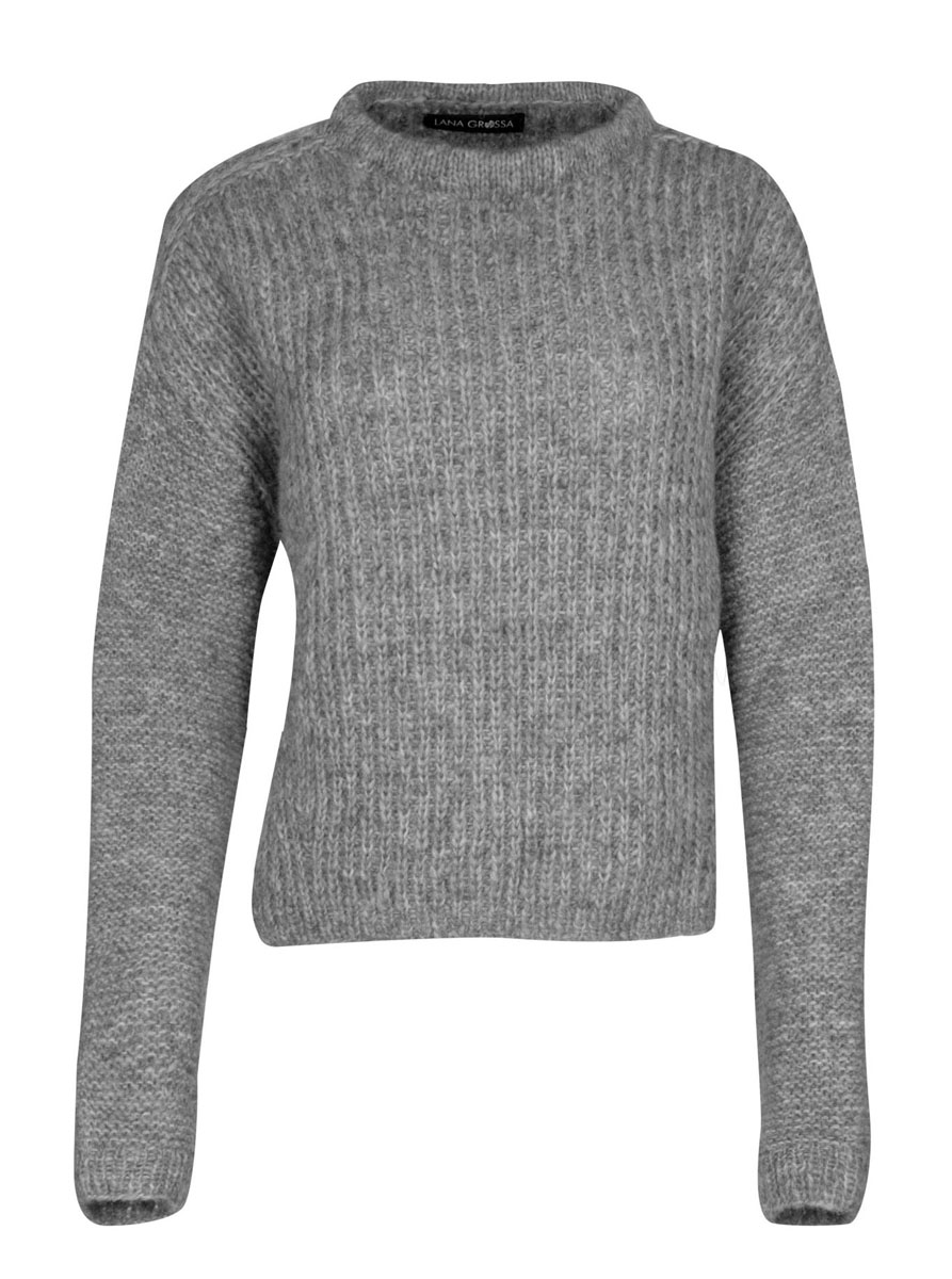 Lana Grossa Lala Berlin Lovely Fine Tweed (37 % Baby Alpaka, 35 % Polyamid, 26 % Schurwolle Merino, 2 % Viskose, Lauflänge 175 m/50 g), 350 (400 – 450) g Hellgrau (Fb 105); Stricknadeln Nr. 5 und 5,5, 1 Rundstricknadel Nr. 5, 40 cm lang.