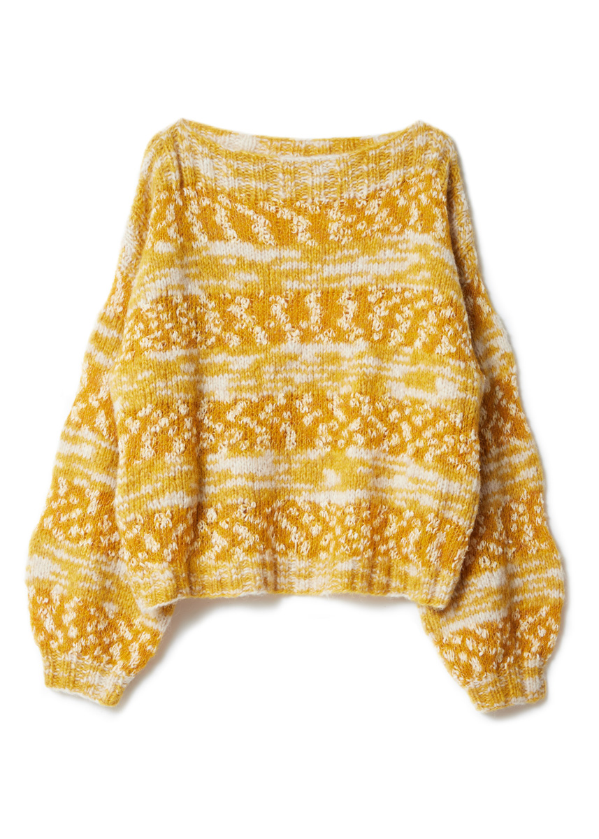 Beim lockeren Pullover mit U-Boot- Ausschnitt wurden zwei Garnneuheiten im Wechsel verstrickt. Die eine kreiert diffuse Streifen, die andere einen knuffigen Bouclé- Effekt. Abgerundet wird das leichte Modell von extralangen Ballonärmeln.