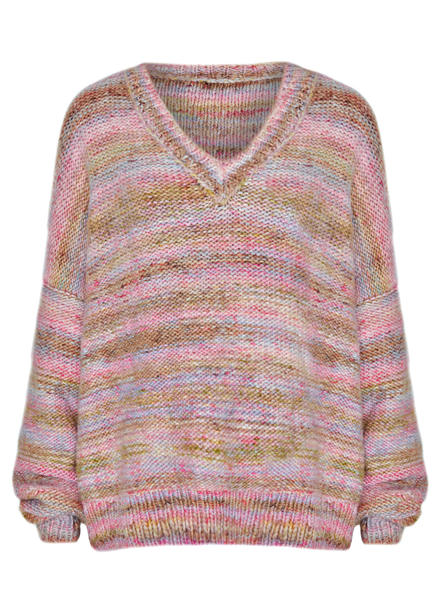 Lana Grossa-Qualität „Lala Berlin Stripy“ (56 % Schurwolle (Merino), 29 % Polyacryl, 14 % (Baby) Alpaka, 1 % Elasthan, Lauflänge 90 m/50 g): ca. 650 (700) g Rosa/Lichtgrün/Beige/Natur/Flieder/Hellgrau (Fb. 10); Stricknadeln Nr. 7 und 8, 1 Rundstricknadel Nr. 7, 60 cm lang, 1 Wollnadel von Lana Grossa.