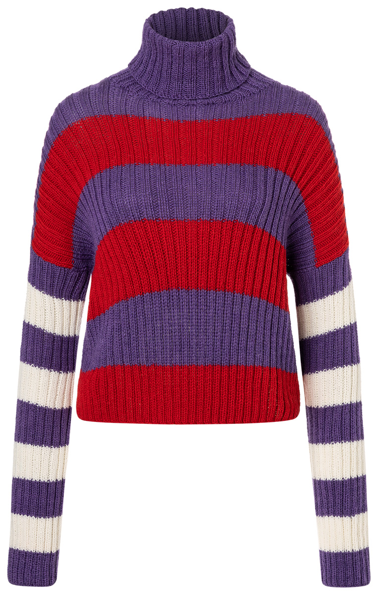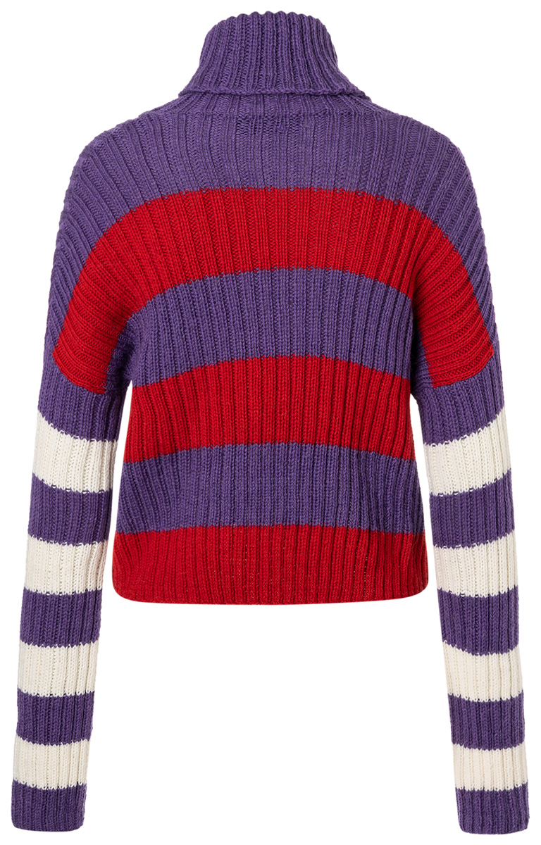 Kleine Rippenrollis kennen wir aus den Siebzigern. Unser Modell bekommt durch überschnittene Schultern und Streifen in Rot, Rohweiß und Violett einen neuen, modernen Touch.