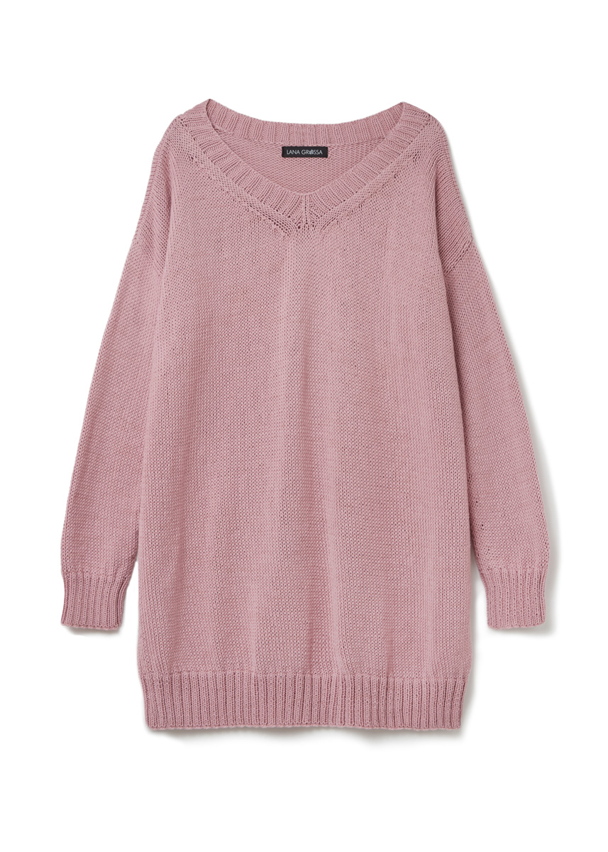 Lana Grossa Landlust Baumwolle (100% Baumwolle (Bio), Lauflänge 115 m/50 g), 500 (550 – 600 – 650) g Altrosa (Fb. 17); Stricknadeln Nr. 3 und 5, sowie 1 Rundstricknadel Nr. 3, 40 cm lang.