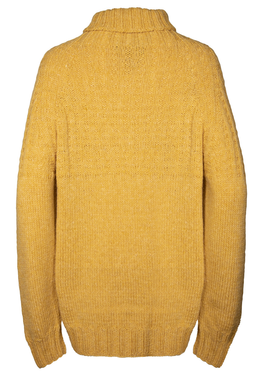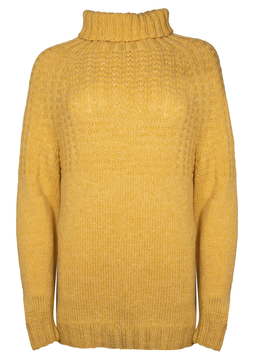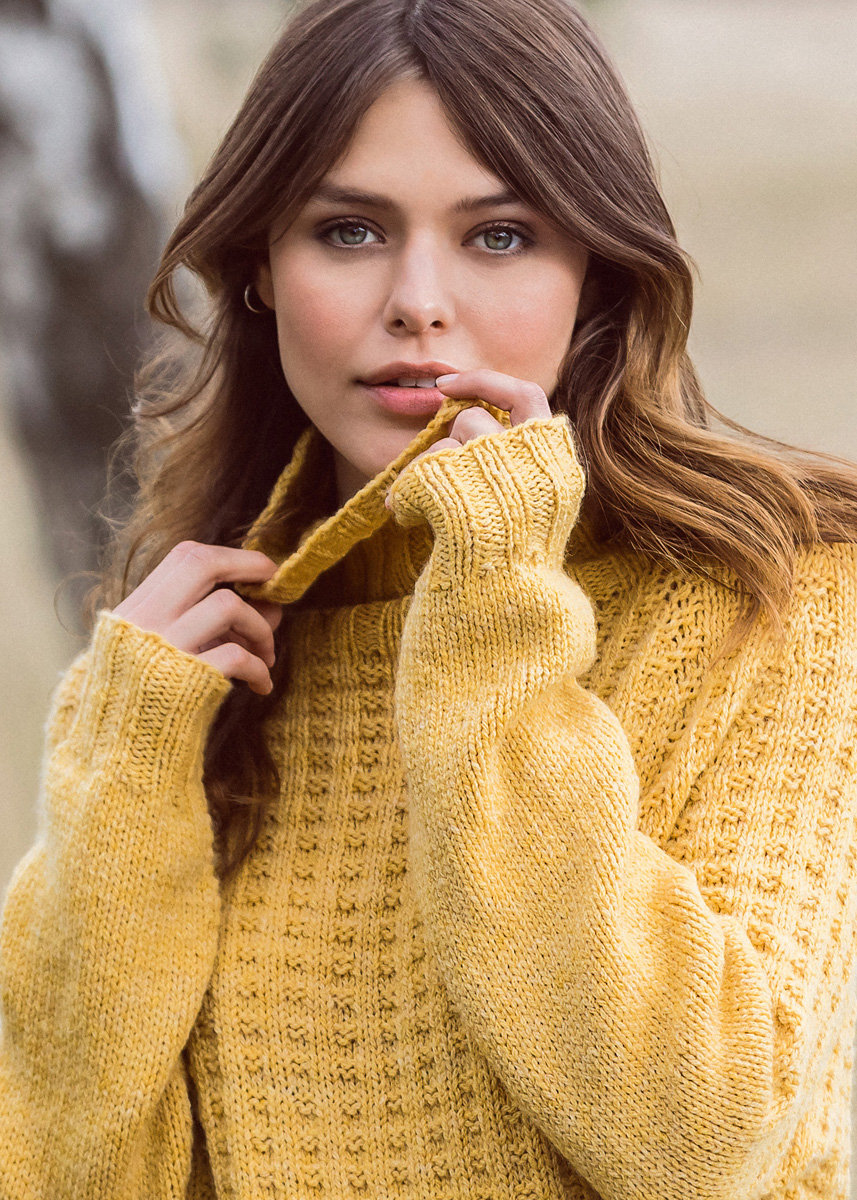 Eine lässige Long-Form, Raglanärmel, ein einfaches Muster und ein gemütlicher Rolli: fertig ist der Wohlfühlpulli. Sein warmes Maisgelb zieht Blicke an und passt super zu Jeans – perfekt für Tage, an denen wir, auch ohne viel Aufwand, gut aussehen möchten.
