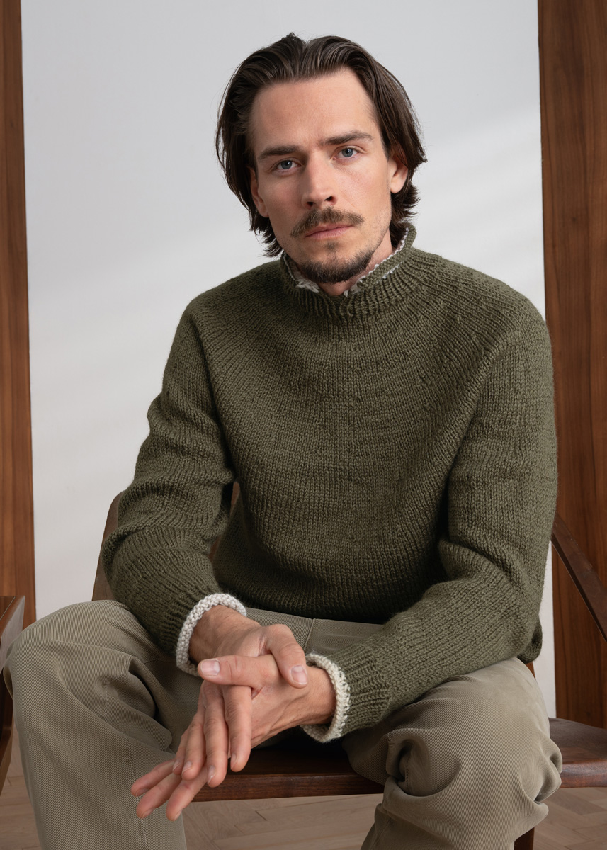 Lana Grossa Landlust Naturwolle (100% (Norwegische) Schurwolle, Lauflänge 85 m/50 g), 650 (700 – 750) g Olivgrün (Fb. 3) und 50 g Grège (Fb. 18); je 1 Rundstricknadel Nr. 5, 40, 60 und 80 cm lang.