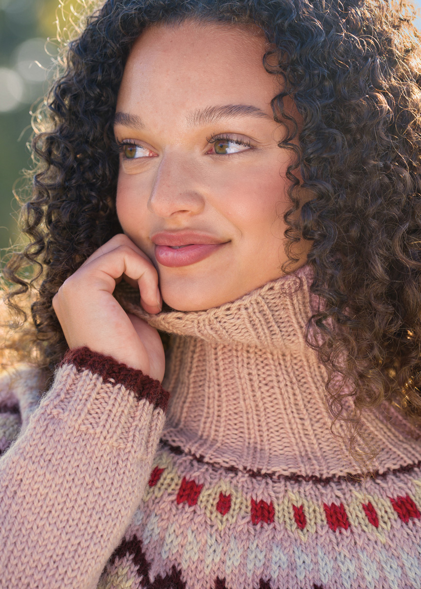 Lana Grossa-Qualität „Landlust Naturwolle“ (100 % (norwegische) Schurwolle, LL = ca. 85 m/50 g): ca. 450 (500 – 550) g Graurosa (Fb. 19), ca. 100 (100 – 150) g Burgund (Fb. 20) und je ca. 50 g Beige (Fb. 17), Grège (Fb. 18) und Rot (Fb. 21); Stricknadeln Nr. 5 und 5,5, je 1 Rundstricknadel Nr. 5,5, 60, 100 und 120 cm lang, 1 Rundstricknadel Nr. 5, 40 cm lang.