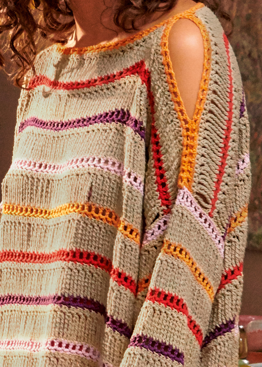 Fünffachstäbchen (beigefarbene Streifen) versorgen den kastenförmigen Ringelpulli mit einem weichen, lässigen Fall. Seine offenen Schulternähte ergeben sexy Cutouts.
