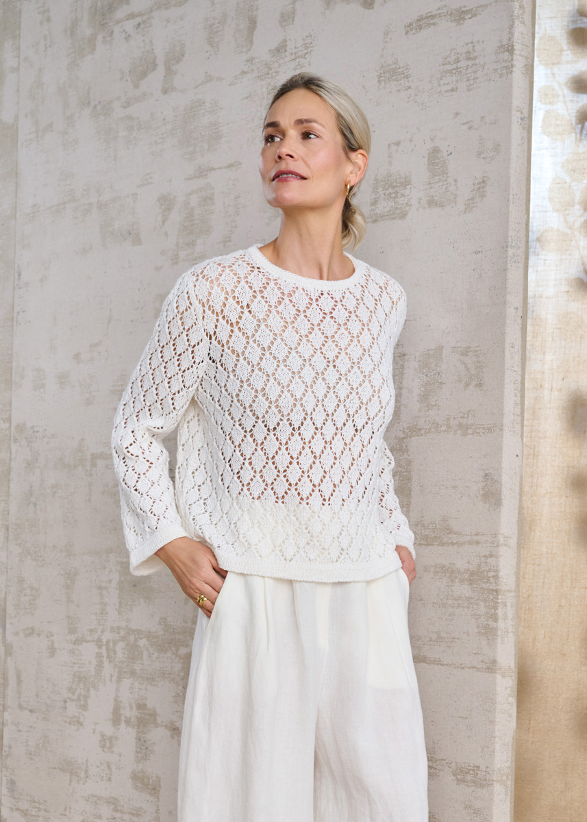 Lana Grossa Landlust Sommerseide (50% Seide, 50% Baumwolle, Lauflänge 170 m/50 g), 300 (350 – 400) g Weiß (Fb. 1); Stricknadeln Nr. 3,5 und 1 Rundstricknadel Nr. 3, 40 cm lang, Hilfsnadel Nr. 3,5.