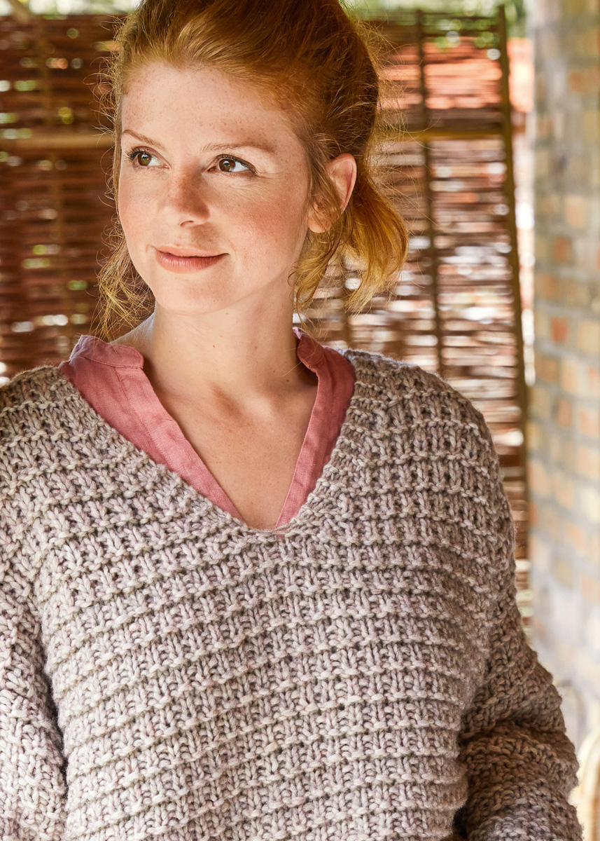 Lana Grossa-Qualität „Landlust Winterwolle“ (50% Schurwolle Merino, 35% Baumwolle, 15% Yak, LL ca. 70 m/50 g), 600 (650 - 700) g Rosa Meliert (Fb 11); Stricknadeln Nr. 8 und Nr. 9, 1 Häkelnadel Nr. 6.