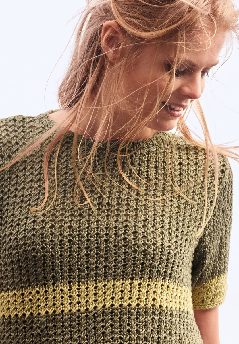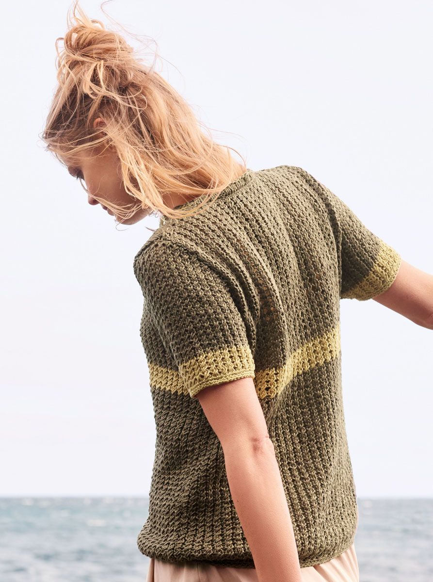 Lana Grossa Linarte (40% Viskose, 30% Baumwolle, 20% Leinen, 10% Polyamid, Lauflänge 125 m/50 g), 300 (350 – 400) g Taupe (Fb 4) und 50 g Sandgelb (Fb 82); Stricknadeln Nr. 4,5, 1 Rundstricknadel Nr. 4,5, 40 cm lang, 1 Häkelnadel Nr. 4.