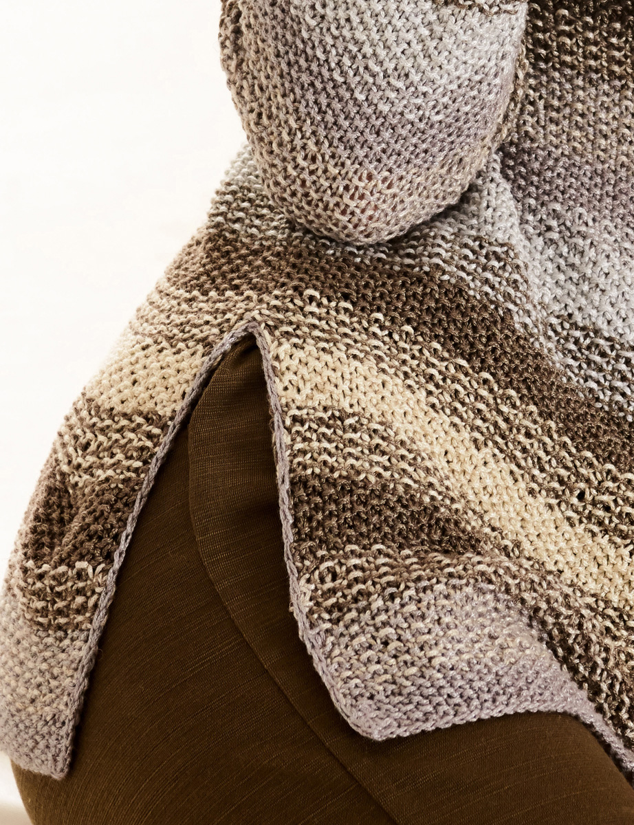 Lana Grossa Linarte (40% Viskose, 30% Baumwolle, 20% Leinen, 10% Polyamid, Lauflänge 125 m/50 g), 150 (200 – 250) g Taupe (Fb 4), 100 (150 – 200) g Platingrau (Fb 33), 100 (150 – 200) g Hellelfenbein (Fb 88), 100 (150 – 200) g Grüngrau (Fb 60), 50 (100 – 150) g Grège (Fb 45); Rundstricknadel Nr. 4 und 1 Häkelnadel Nr. 3,5.