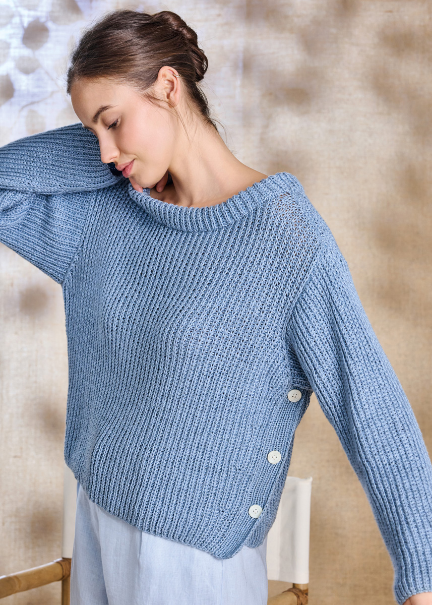 Lana Grossa Linarte (40% Viskose, 30% Baumwolle, 20% Leinen, 10% Polyamid, Lauflänge 125 m/50 g), 700 (750 – 800) g Graublau (Fb. 76); Stricknadeln Nr. 4,5, sowie 1 Rundstricknadel Nr. 4,5, 40 cm lang, und 3 Knöpfe von UNION KNOPF, Fb. Perlmutt, Ø 20 mm.