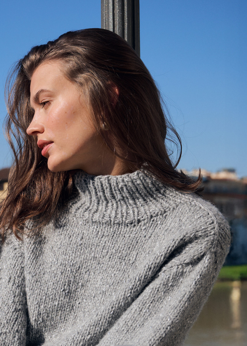 Garnneuheit Lucciola sorgt hier für Struktur und glitzernde Highlights. Gestrickt wird nahtlos, von oben nach unten. Die dekorativen Lochmuster-Details entstehen durch betonte Zunahmen mit Umschlägen.