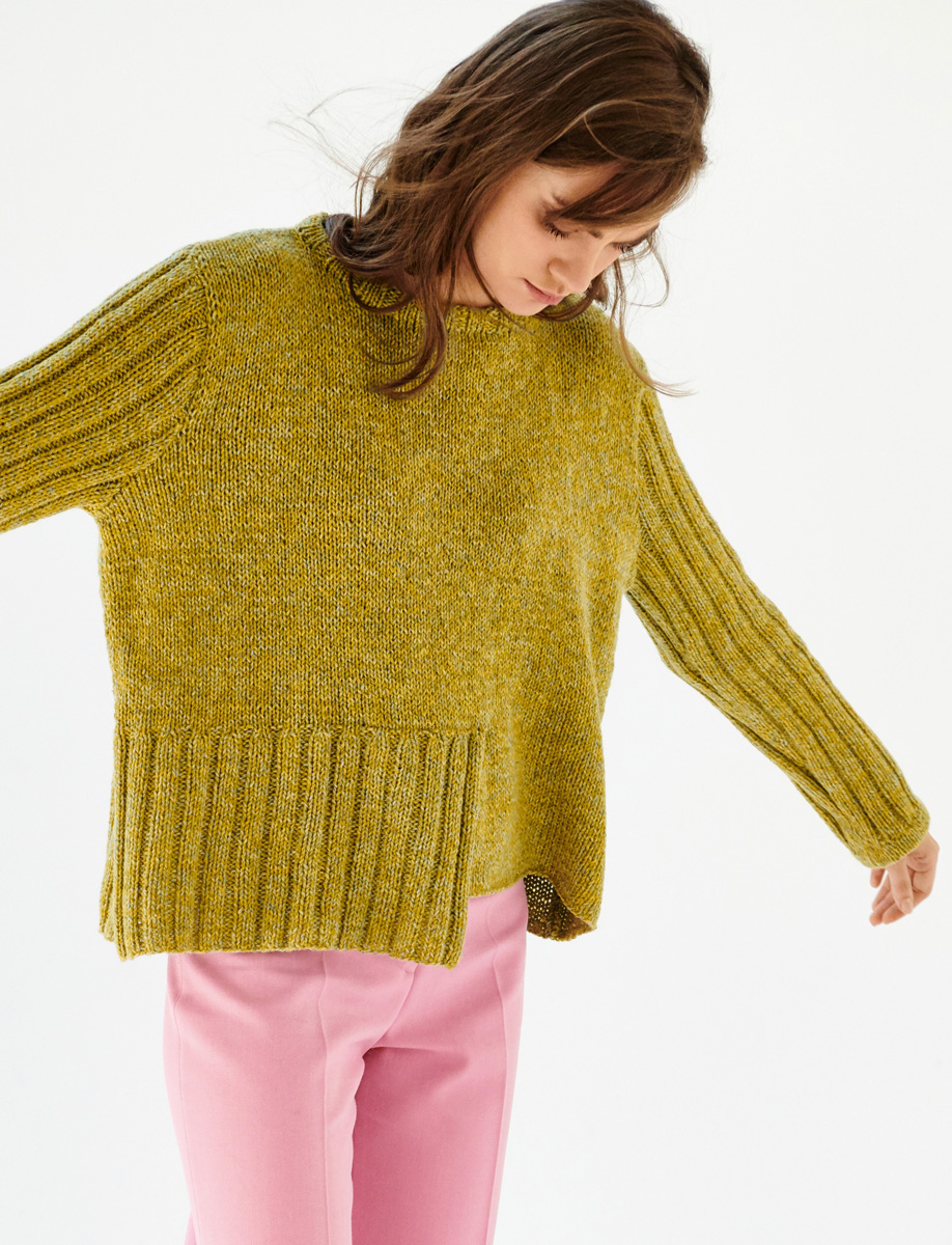Der raffinierte Schnitt am Vorderteil macht diesen Pullover zu etwas ganz Besonderem. Dann ist er auch noch in diesem spannenden Grünton verstrickt – wir sind verliebt.