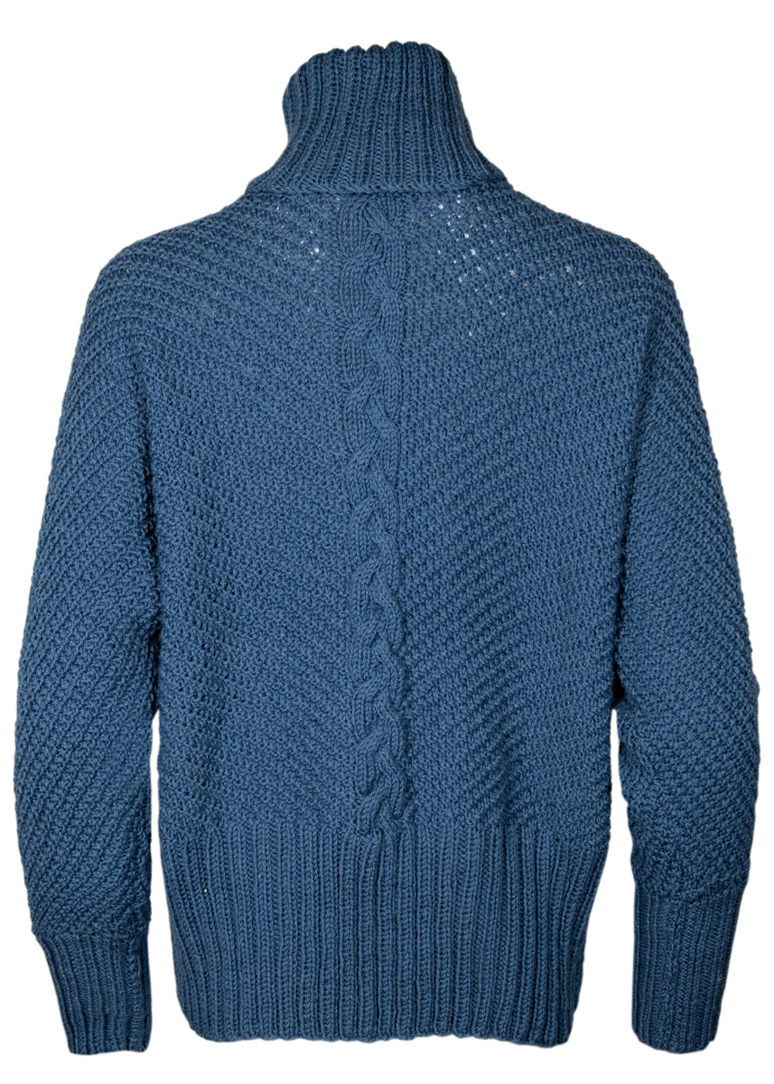 Mit Fledermausärmeln und den extrabreiten Bündchen zitiert der jeansblaue Rolli die Looks der 1980er. Die Merinowolle strickt und trägt sich angenehm – und bringt das Strukturmuster perfekt zur Geltung.