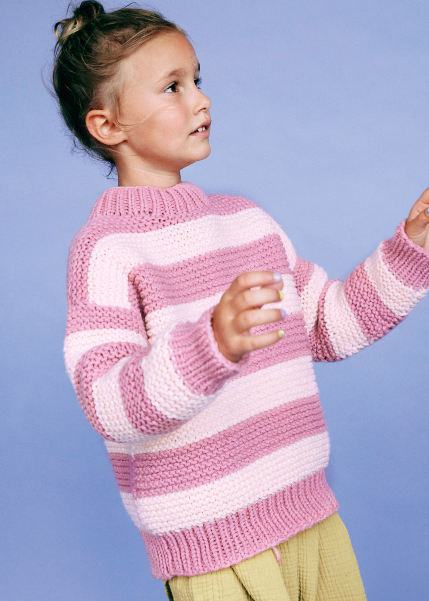 Lana Grossa Mille II (50% Schurwolle (Merino extrafein), 50% Polyacryl, Lauflänge 55 m/50 g), 300 (350 – 400) g Altrosa (Fb. 121) und 250 (300 – 350) g Creme (Fb. 149); Stricknadeln Nr. 5,5 und 6, je 1 Rundstricknadel Nr. 5,5 und 6, 40 und 60 cm lang, sowie 1 Häkelnadel Nr. 5.