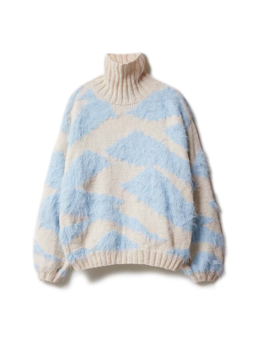 Von einer Winterlandschaft inspiriert wirken die eingestrickten, zartblauen Passagen auf rohweißem Grund. Zugegeben, die Intarsientechnik ist etwas tricky – aber die Mühe lohnt sich, wenn das Ergebnis so sensationell ist.