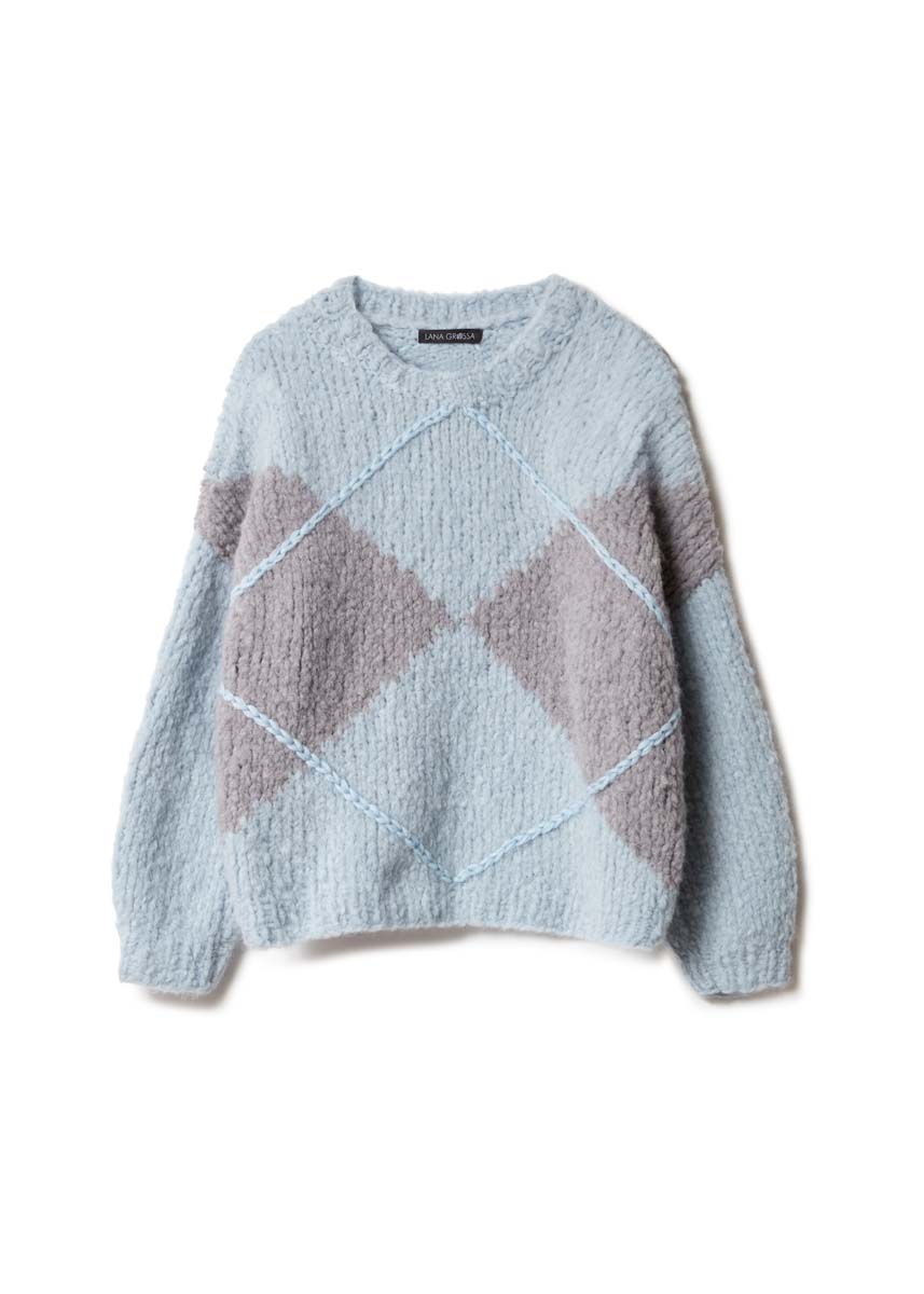 Für diesen Alpaka-Pulli haben wir das legendäre, schottische Argyle- Muster (der modebewusste König Edward VIII trug es zum Golfen!) extrem herangezoomt. Die plastischen Rautenlinien werden nachträglich, Ton-in-Ton, aufgehäkelt.