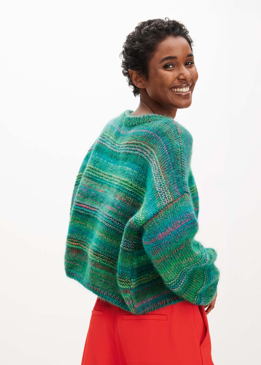 Bei diesem flippigen Pulli ist Silkhair für den Flauschfaktor verantwortlich, während Colorissimo aus nur zwei Farbmischungen seiner Palette all diese Töne beisteuert: Petrolblau, Pink, Apfelund Hellgrün, Rot, Jade, Schwarzblau, Oliv, Türkis, Orange, Schwarzbraun, Graublau, Graugrün und Nougat …