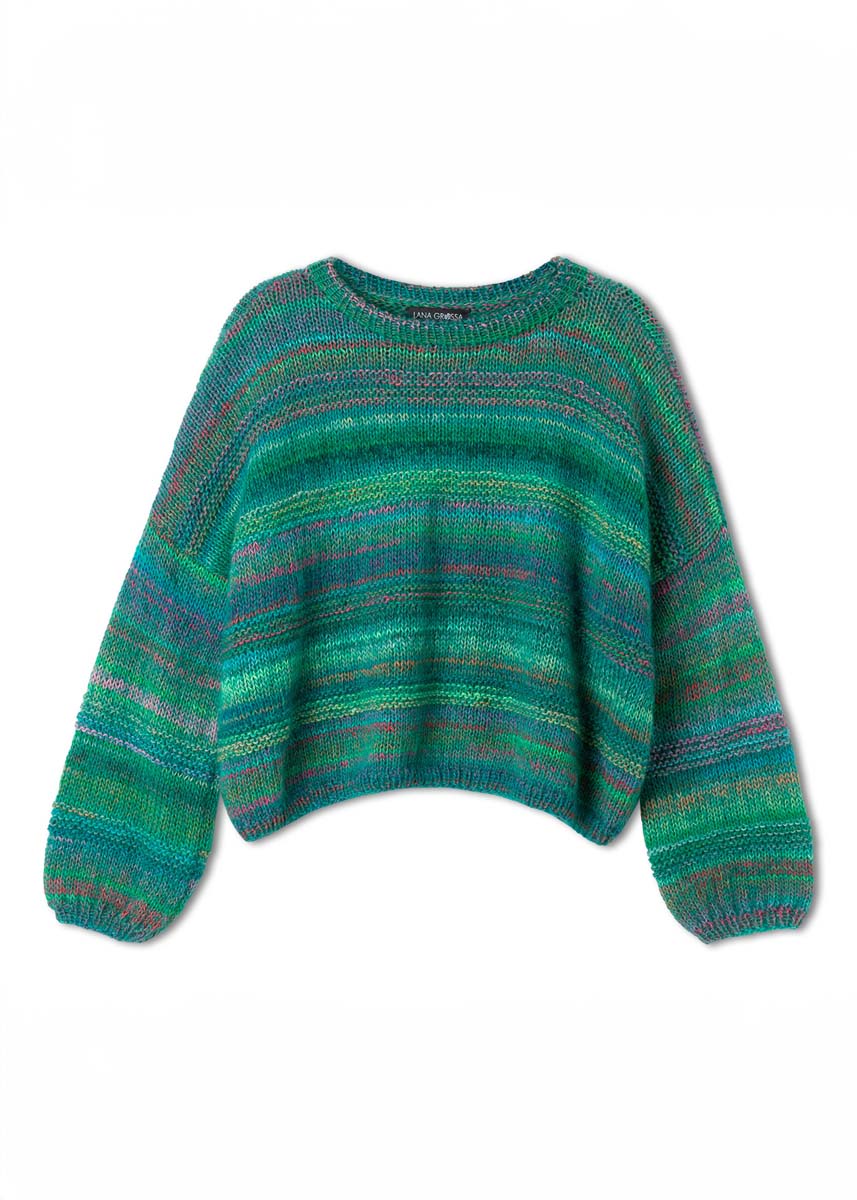 Lana Grossa-Qualität „Colorissimo” (100 % Schurwolle (Merino Fine), LL = ca. 300 m/100 g): ca. 200 (300) g Petrolblau/Pink/Apfel-/Hellgrün/Rot/Jade/Schwarzblau (Fb. 203) und ca. 100 (200) g Oliv/Türkis/Hellgrün/Petrol/ Orange/Schwarzbraun/Graublau/-grün/Nougat (Fb. 209) und Lana Grossa-Qualität „Silkhair” (70 % Mohair (Superkid), 30 % Seide, LL = ca. 210 m/25 g): ca. 125 (150) g Smaragd (Fb. 156); Stricknadeln Nr. 5 und 6, 1 Rundstricknadel Nr. 5, 50 cm lang.