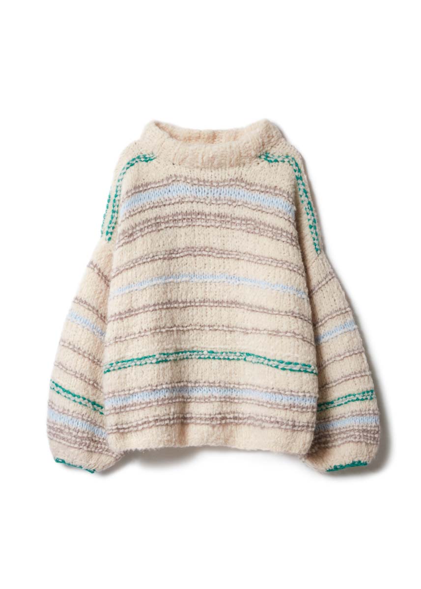 Zwei Alpaka-Garne als Dreamteam: Die plastische Struktur des kastig kurzen Pullovers entsteht durch unterschiedliche Garnstärken und farbige, zum Teil kraus gestrickte Kontraststreifen. Ballonärmel und der doppelte Turtleneckkragen sind das Tüpfelchen auf dem i.