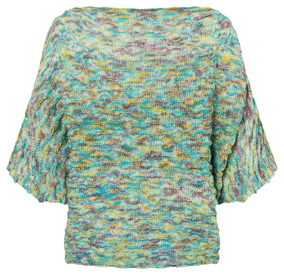 Lana Grossa Ecopuno hand-dyed (72% Baumwolle, 17% Schurwolle (Merino), 11% (Baby) Alpaca, Lauflänge 215 m/50 g), 450 (500 – 500) g Surya (Fb 507) und Lana Grossa Ecopuno (72% Baumwolle, 17% Schurwolle (Merino), 11% (Baby) Alpaka, Lauflänge 215 m/50 g), 100 g Khaki (Fb 27); Pullover: Je 1 Rundstricknadel Nr. 2,5 und 3,5, 80 cm lang und 1 Häkelnadel Nr. 3, Stulpen: Je 1 Spiel Stricknadeln Nr. 3 und 3,5.