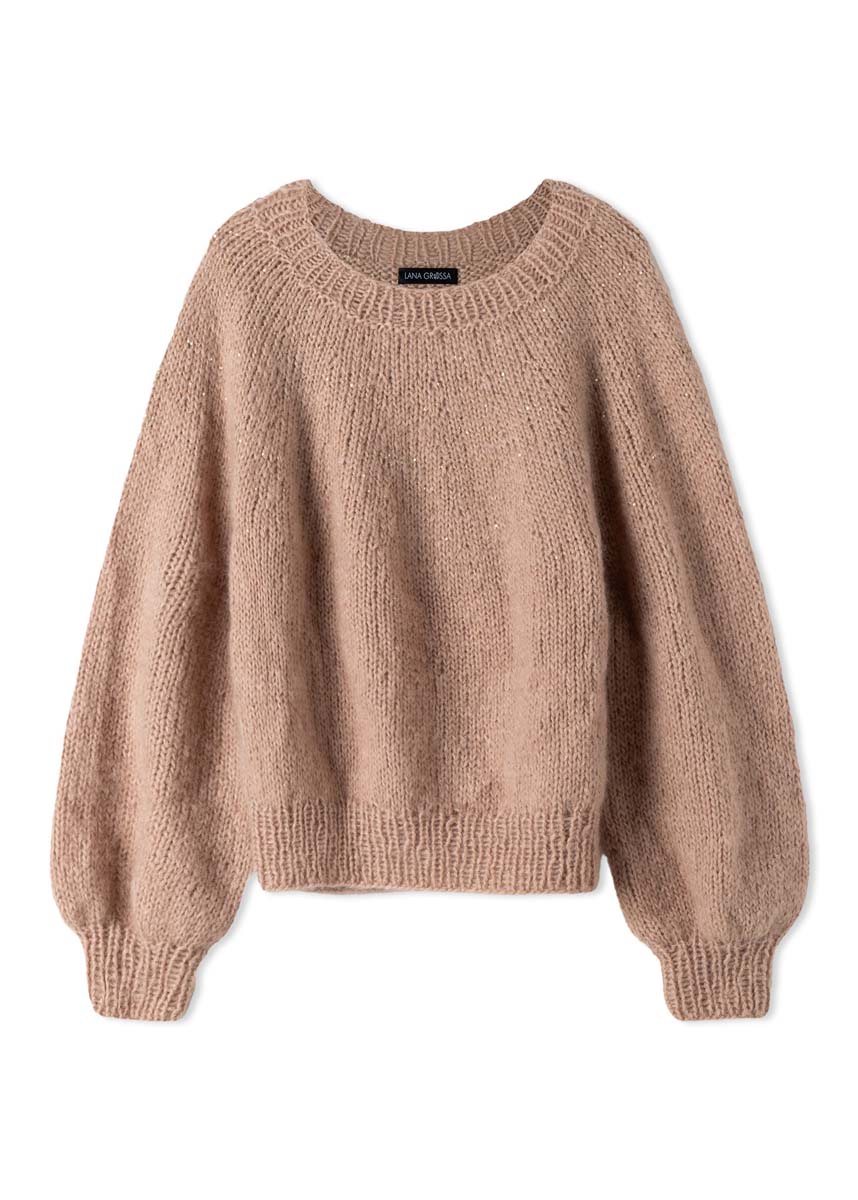 Softes Garn, eine zeitlose Farbe, die Rundpasse brilliert mit Mini-Pailletten. Dazu eine rundum schmeichelnde Passform: Ein TOP-DOWN-SWEATER der Königsklasse.