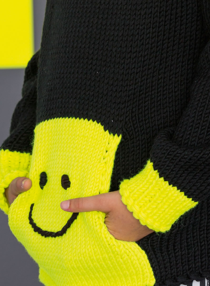 Lana Grossa Qualität „Superbingo“ (100% Schurwolle, LL = 55 m/50 g), ca. 600 (650) g Schwarz (Fb 8) und „Superbingo Neon“ (100% Schurwolle, LL = 55 m/50 g), ca. 150 g Neongelb (Fb 301), Stricknadeln Nr. 5 und 6, 1 kurze Rundstricknadel Nr. 5, 1 Spielstricknadeln Nr. 5 und 6.