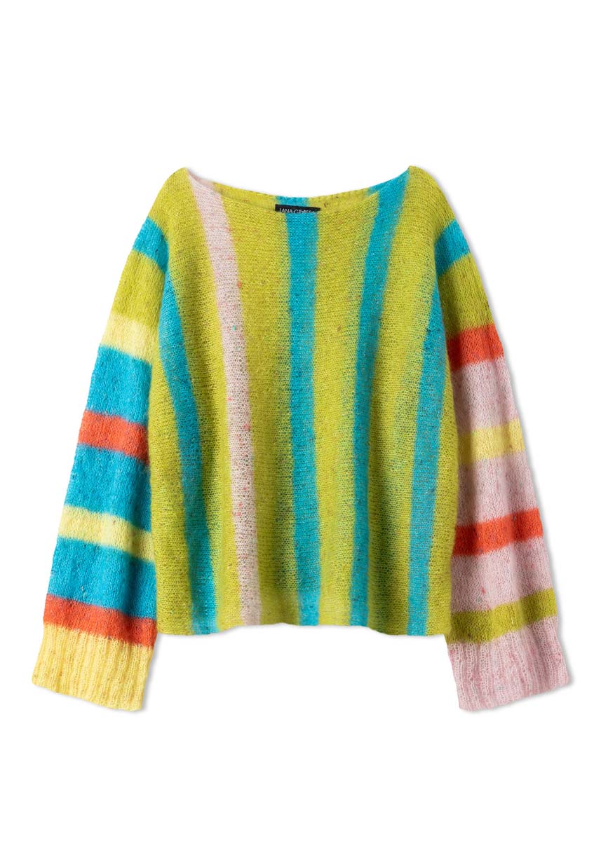Um 90 Grad gedreht entfalten Streifen eine brandneue Wirkung. Am einfachsten gelingen sie, wenn man sie quer – von Ärmel zu Ärmel – strickt.