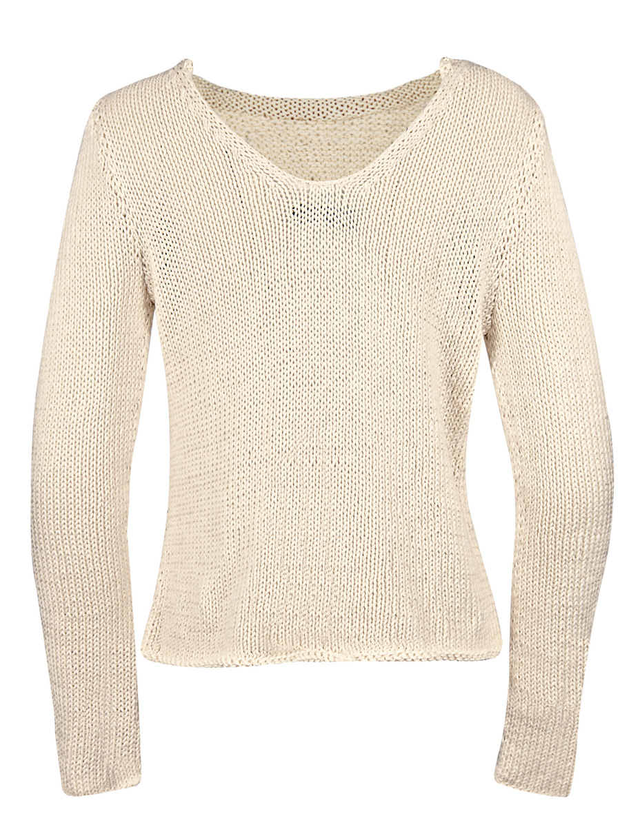 Lana Grossa-Qualität „Organico” (100 % (Bio) Baumwolle, LL = ca. 90 m/50 g): ca. 400 (450 – 500) g Ecru (Fb. 6); Stricknadeln Nr. 5,5, 1 Rundstricknadel Nr. 6, 60 cm lang.