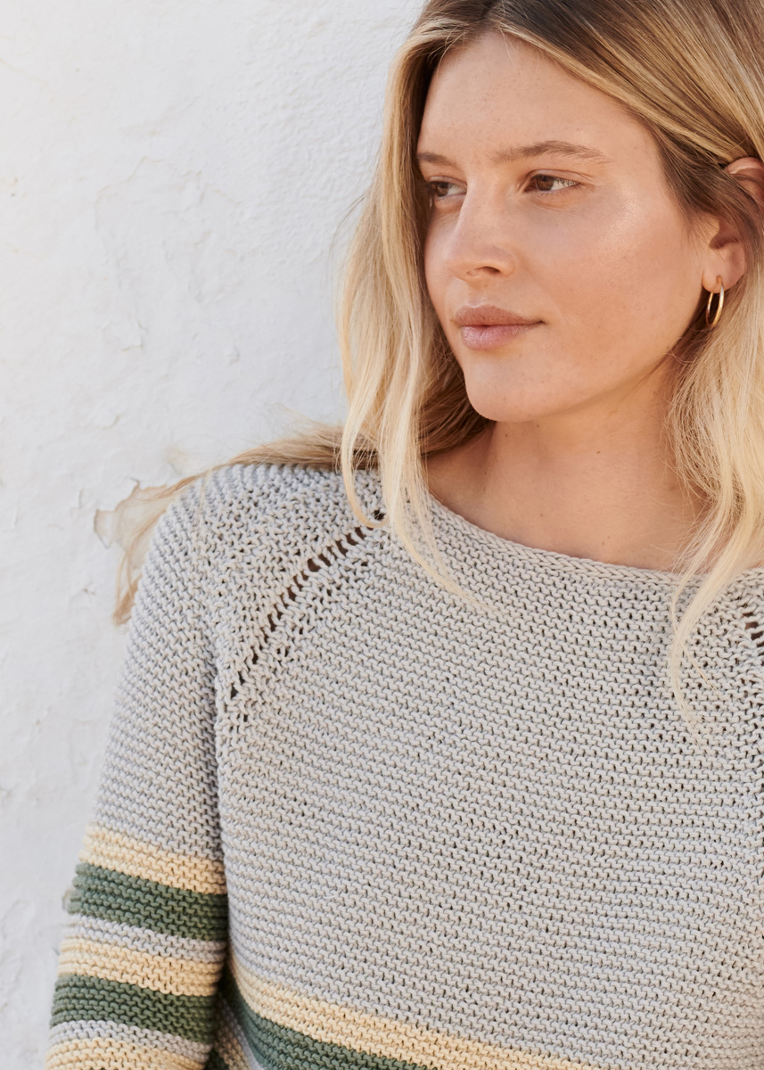 Beim kraus gestrickten Sweater zaubern dekorativ betonte Raglanschrägen eine schmale Silhouette. Ebenso raffiniert: der Mix aus lässigen Ringeln und sanften Tönen.