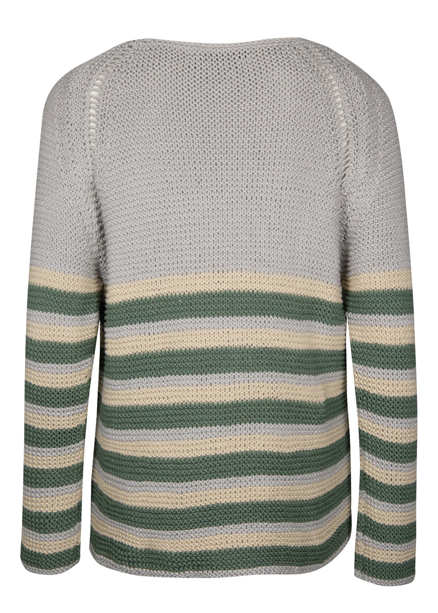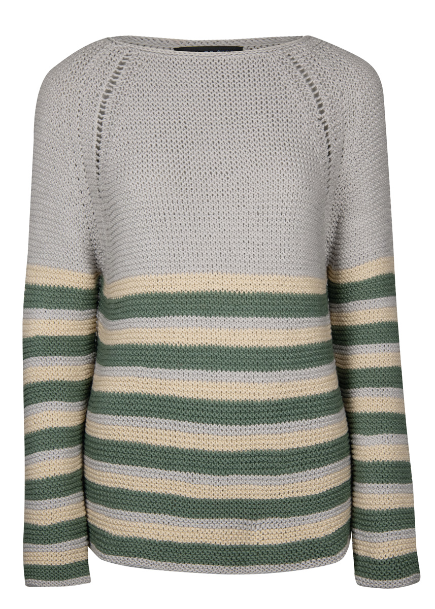 Lana Grossa Organico (100% Bio Baumwolle, Lauflänge 90 m/50 g), 250 (300 – 350) g Hellgrau (Fb 29), 200 (250 – 250) g Schilfgrün (Fb 130) und 150 (200 – 200) g Beige (Fb 100); Stricknadeln Nr. 4,5 und 1 Häkelnadel Nr. 4.