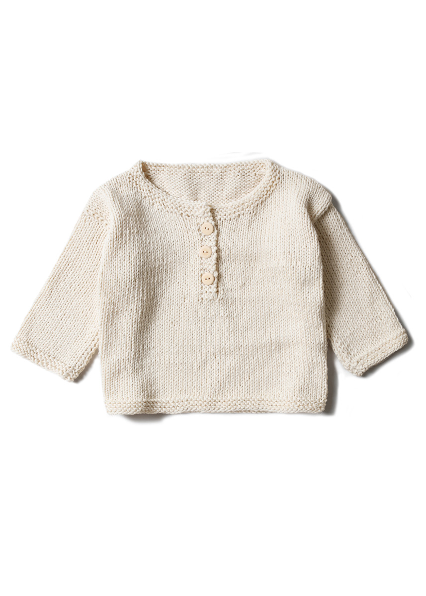 Lana Grossa Organico (100 % Baumwolle (Bio), Lauflänge = 90 m/50 g): 150 (150/200) g Ecru (Fb 6); Stricknadeln Nr. 4,5, je eine 40 und eine 60 cm lange Rundstricknadel Nr. 4,5; drei Knöpfe mit 15 mm Ø.