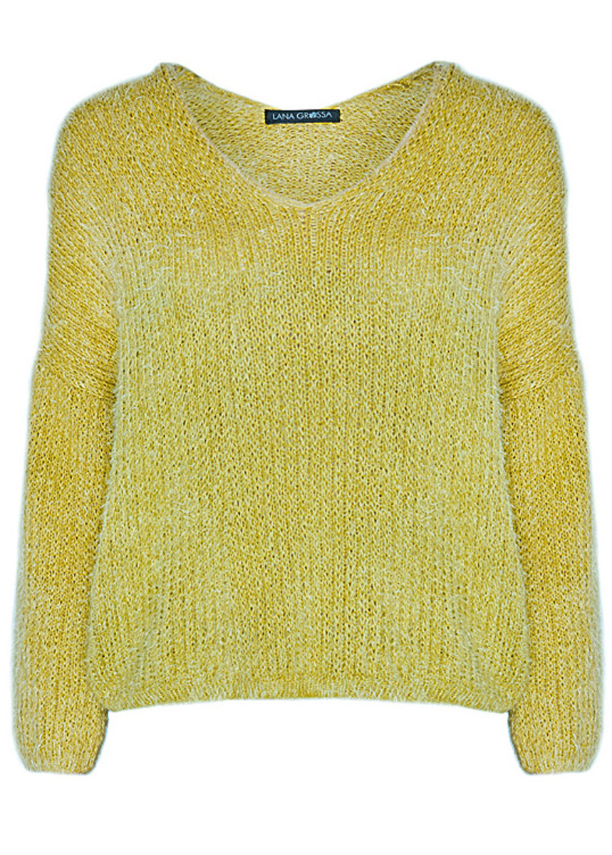 Lana Grossa-Qualität „Per Fortuna“ (74 % Bio Baumwolle, 26 % Polyamid, Lauflänge 190 m/50 g): ca. 300 (350 – 400) g Senf (Fb. 13); Stricknadeln Nr. 3 und 6.