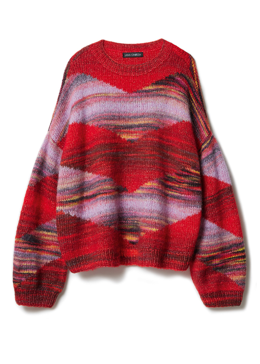 Lana Grossa-Qualität „Picasso“ (36% Schurwolle (Merino extrafine), 36 % Alpaca (Baby), 28 % Polyamid, LL = ca 210 m/50 g): ca 200 (200 - 250 - 250) g Wein-/Kirsch-/Feuerrot/Braunrot/Nougat (Fb 12) = Farbe A und ca 150 (150 - 200 - 200) g Himbeer/Lachs/ Graubraun/Beige/Graulila/Flieder/Taupe (Fb 9) = Farbe B; Stricknadeln Nr 5 und 5,5; 1 kurze Rundstricknadel Nr 5.