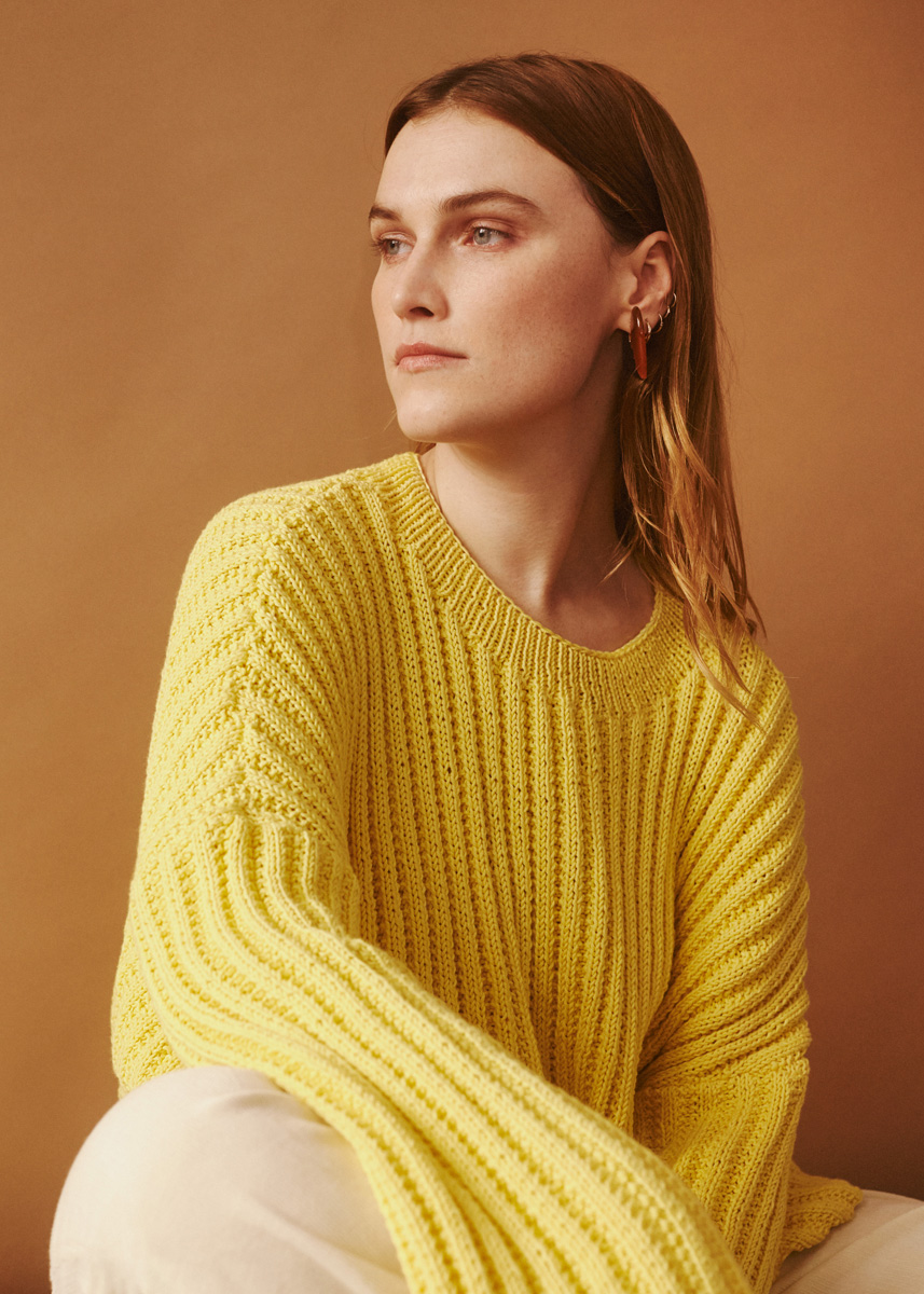 Lana Grossa „Pima“ (100% Pima Baumwolle; Lauflänge 125 m/50 g), 600 (650/700) g in Gelb (Fb. 11); Stricknadeln Nr. 3, 1 Rundstricknadel Nr. 3 in 40 cm Länge.