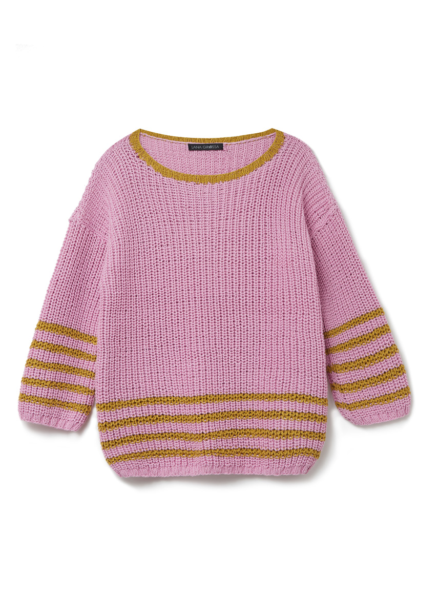 Ein ungewöhnlicher Mix aus Curry und Fliederrosa macht diesen Klassiker interessant. Sein plastisches Halbpatentmuster wird durch voluminöse Garne betont.