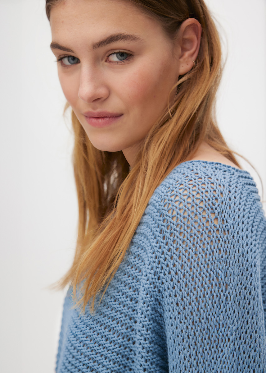 Lana Grossa „Promessa“ (70 % (Bio) Baumwolle, 30 % recyceltes Polyamid, Lauflänge 125 m/50 g), 350 (400 – 450 - 500) g Graublau (Fb. 20); Stricknd Nr 5 und 10.